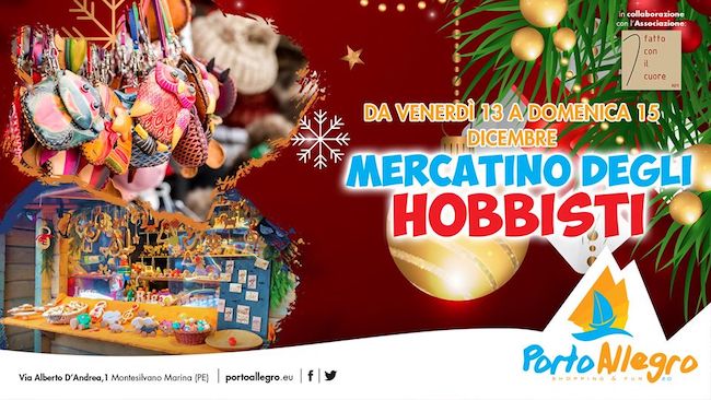 MONTESILVANO – Nuovo appuntamento nel weekend con la Fiera degli Hobbisti presso il centro commerciale Porto Allegro di Montesilvano. Venerdì 15, sabato 16 e domenica 17 dicembre con orario di apertura 9 – 23 si potranno visitare tante bancarelle allestite all’interno del centro con oggetti artigianali e curiosi per bambini ma anche per adulti. L’ingresso è gratuito.