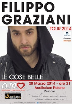 PESCARA – Musica e solidarietà. Venerdì prossimo, 28 marzo alle ore 21 presso l’Auditorium Flaiano ci sarà il concerto di Filippo Graziani (figlio del grande Ivan) reduce da sanremo giovani con la canzone “Le cose belle”. L’iniziativa, promossa dall’Associazione Massimo Oddo Onlus di cui il campione del mondo Massimo Oddo è presidente, è rivolta ad aiutare l’associazione Rio de Oro Montefeltro impegnata nell’accoglienza di bambini minori e disabili della popolazione Saharawi (popolo nomade del Sahara) qui in italia nel mese di luglio e agosto.
