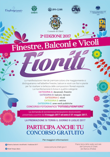 anifestazioni, Antonio Viola, e la Presidente della Commissione Turismo, Sport e Tempo Libero, Consigliera Comunale Maura Micomonaco, comunicano che, per consentire ulteriori iscrizioni, è stata prorogata fino al 18 giugno 2017 la scadenza per la presentazione delle domande di partecipazione alla seconda edizione del concorso, “Finestre, balconi, vicoli fioriti Città di Chieti”.