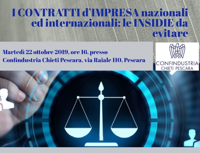 Confindustria Chieti Pescara per questo ha organizzato domani, martedì 22 ottobre, alle ore 16, nella sede di via Raiale il focus di approfondimento “I contratti d’Impresa nazionali ed internazionali: le insidie da evitare”. Al focus, che prevede una sessione aperta al dibattito, parteciperanno Silvano Pagliuca e Luigi Di Giosaffatte, rispettivamente presidente e direttore generale di Confindustria Chieti Pescara; e l’avvocato Marco Riario Sforza, esperto in Contrattualistica d’impresa nazionale ed internazionale, che spiegherà gli aspetti dei contratti di appalto, vendita, distribuzione e somministrazione per le imprese che operano in Italia e all’estero.