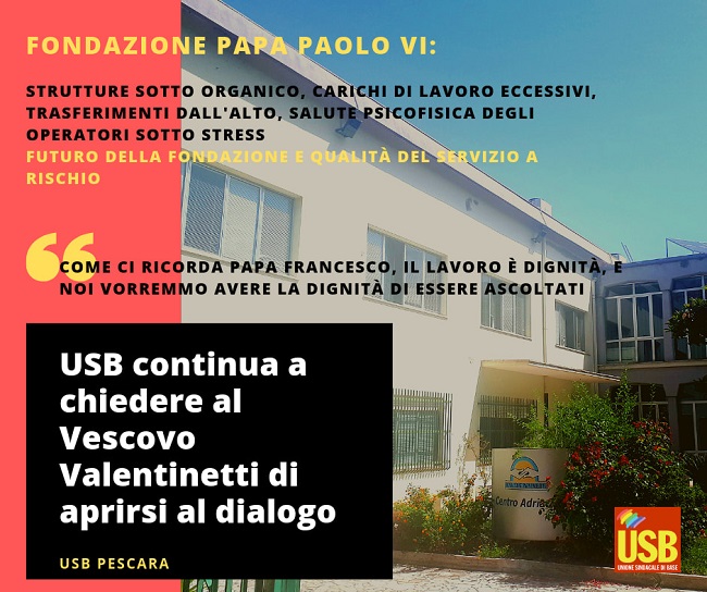 PESCARA – Ieri mattina davanti il Centro Adriatico sul lungo mare di Pescara i lavoratori dell’Unione Sindacale di Base della Fondazione Papa Paolo VI hanno effettuato un volantinaggio di denuncia pubblica sulle condizioni della stessa.