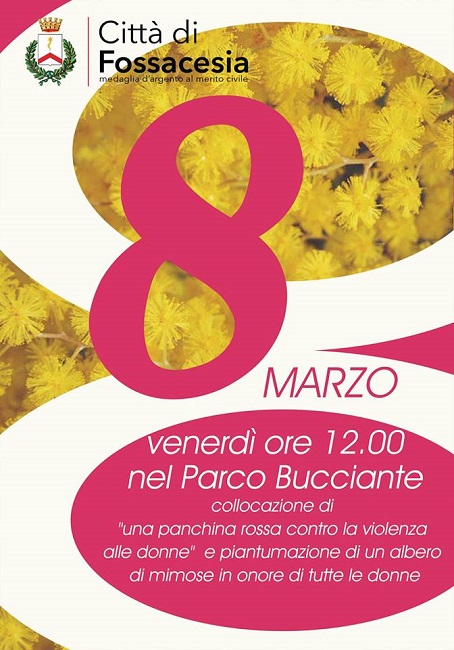 FOSSACESIA (CH) – Anche Fossacesia si mobilita contro il fenomeno della violenza sulle donne. Lo farà venerdì 8 marzo, in occasione della Giornata internazionale delle Donne, alle ore 12, nel Parco Bucciante, dove sarà sistemata una Panchina Rossa, che si ergerà a simbolo della lotta alla violenza sulle donne. L’evento è promosso dal Comune di Fossacesia.