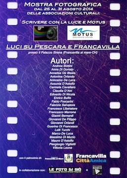 “Dopo il grande successo della pizzica, siamo veramente orgogliosi di chiudere la stagione estiva con un altro importante evento, che ci pone anche quest’anno come una delle associazioni più attive nell’ambito del panorama estivo francavillese”, dichiara il Presidente Motus Michele Accettella. “Con questo evento la MOTUS dimostra ancora una volta la propria versatilità e la volontà di valorizzare il territorio. Siamo orgogliosi della cooperazione con l’associazione SCRIVERE CON LA LUCE del Pres. Giovanni Orlandi, a cui vanno i nostri più sinceri ringraziamenti per l’impegno profuso nella realizzazione delle foto che saranno oggetto della mostra. Un ringraziamento particolare, infine, va all’Amministrazione di Francavilla al Mare per averci offerto il proprio ormai abituale appoggio organizzativo”.