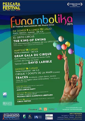 LE NUMEROSE SORPRESE PARALLELE … – Il 15 Luglio al Porto Turistico Wu Ming e El Grito daranno vita al singolare esperimento di letteratura e circo “Piccolo Circo Magnetico Libertario”. Il 30 Luglio all’Outlet Village di Città S.Angelo sarà ospitato lo show del Circo Vertigo, la più interessante realtà italiana di circo contemporaneo. Tornano anche i corsi di Piccolo Circo per bambini (9-13 Luglio, Porto Turistico). Tra le novità, Funambolika é stata scelta dal progetto nazionale di formazione del pubblico “Quinta Parete” per spettatori consapevoli, che prevede incontri tra pubblico e artisti.