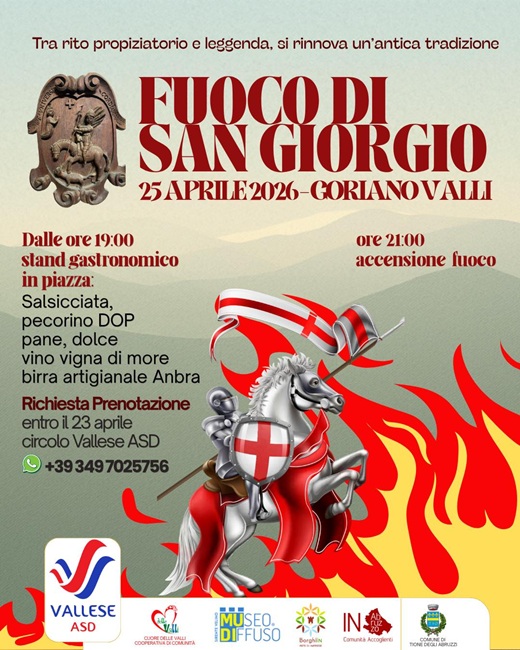 TIONE DEGLI ABRUZZI – A Goriano Valli il 25 aprile non è una data qualunque. È il giorno in cui la comunità si stringe attorno a una delle tradizioni più antiche e identitarie del territorio: il Fuoco di San Giorgio, un rito propiziatorio che affonda le radici nella leggenda e che ogni anno rinnova un legame profondo con la memoria collettiva.