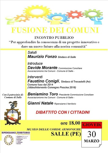 SALLE (PE) – Giovedì 30 Marzo 2017 alle ore 18, a Salle (Pe) presso il Museo delle Corde Armoniche, si discuterà con i Cittadini dei vantaggi economici e sociali derivanti da un’ipotesi di fusione dei Comuni Comuni dell’area : Salle, Tocco Casauria, Caramanico Terme, San Valentino, Sant’Eufemia Maiella, Bolognano, Abbateggio, Roccamorice.