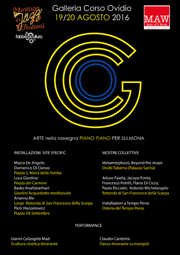 Promossa dall’Associazione Muntagninjazz con Fabbrica Cultura e realizzata dal Laboratorio d’arte MAW, Galleria Corso Ovidio è un’esposizione “diffusa” che vede un’occupazione temporanea da parte di artisti di siti e di spazi architettonici abitualmente destinati ad altre funzioni sociali. Un’idea che nel nome allude all’ambiente dedicato per eccellenza alla fruizione dell’arte ma anche ad una strategia di relazione e di contatto dell’azione artistica con le persone e i luoghi quotidiani.