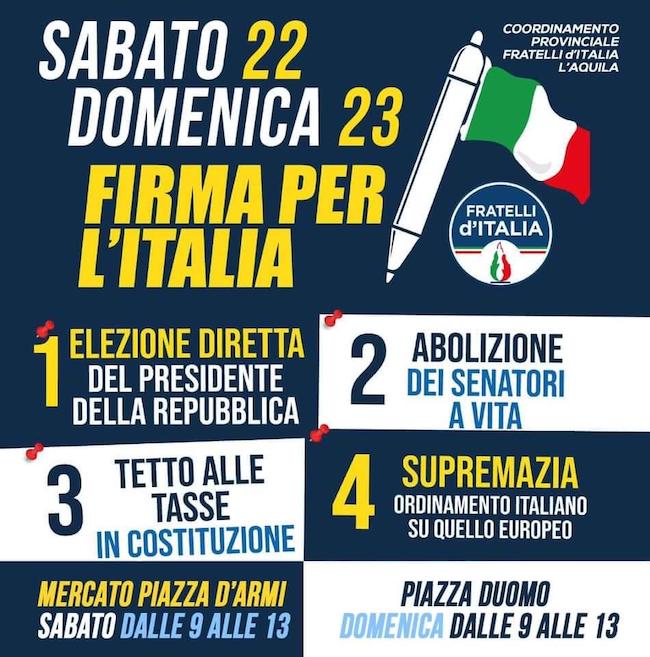 L’AQUILA – Elezione diretta del Presidente della Repubblica, abolizione dei senatori a vita, tetto massimo alla pressione fiscale nella Costituzione e supremazia dell’ordinamento italiano su quello europeo. Fratelli d’Italia riprende in città la campagna di raccolta firme a favore di quattro proposte di legge di iniziativa popolare lanciate da Giorgia Meloni.