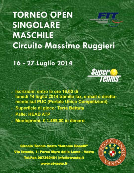 Sui campi del Circolo Tennis Vasto “Antonio Boselli” si è concluso, domenica 27 luglio, il torneo di tennis open maschile del Circuito Massimo Ruggieri, riservato a giocatori NC, di 4° categoria, di 3° categoria e di 2° categoria. Si è trattato di una competizione di buon livello per la presenza, tra gli iscritti, di giocatori quali: Simoni Marco, con classifica italiana 22, tesserato con l’ASD Sporting Tennis Club Borgaro (Borgaro Torinese); Di Nicola Gianluca 23, tesserato con il Circolo Tennis L’Aquila, con il quale ha disputato il campionato di serie A2, n. 1375 della classifica ATP, vincitore del Torneo Open BNL di prequalificazione degli Internazionali d’Italia, svoltosi nel mese di aprile al Circolo Tennis Pescara, vincitore del torneo open di Chieti nel mese di aprile, finalista del torneo open di Prati 37; Rubino Vittorio 24, tesserato con il Circolo Tennis Maglie, con il quale ha giocato il Campionato di serie A2, recente vincitore del Torneo Open di Tagliacozzo, n. 1156 della classifica ATP; Iannuzzi Enrico 24, tesserato con il Circolo Tennis L’Aquila, con il quale ha disputato il campionato di serie A2; Sgrignoli Fabio 27, tesserato per il Circolo Tennis Lanciano con il quale ha sfiorato la promozione in serie A1. Tra i partecipanti anche due tesserati del Circolo Tennis Pescara: Patrizio Marchegiani 26 e Marco Pantalone 27, componenti della squadra di serie B.