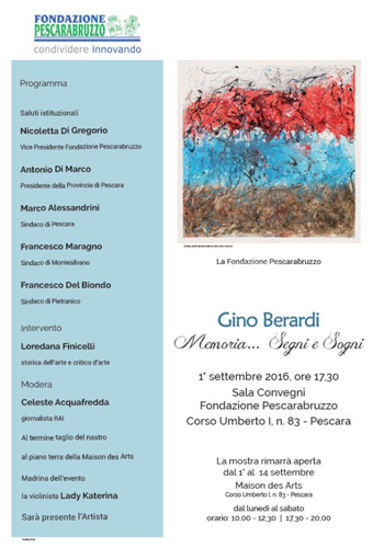 Altrettanto denso il commento artistico della Vice Presidente della Fondazione Pescarabruzzo Nicoletta di Gregorio: “Gino Berardi, nei suoi dipinti, interpreta la contemporaneità partendo dalla propria visione esistenziale che aderisce, nonostante tutto, a una joie de vivre capace di evocare l’alterità di uno stupore memoriale […] il richiamo al dripping di Pollock viene ampliato e sviluppato nella recente produzione attraverso il passaggio a una pennellata più distesa e a una impronta informale più evidente”.