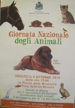PESCARA – Oggi, 3 ottobre, Pescara sarà una delle piazze italiane dove si celebrerà La Giornata Nazionale degli animali, il tradizionale appuntamento ENPA che, nel weekend più vicino alla ricorrenza di San Francesco (2-3 ottobre 2010), dà la possibilità ai milioni di zoofili italiani di incontrarsi a festeggiare gli amici a quattro zampe. L’obiettivo dell’ edizione 2010 è di raccogliere contributi per acquistare nuove cucce e ripari per gli oltre 20.000 trovatelli che ogni anno vengono accuditi dai volontari Enpa.