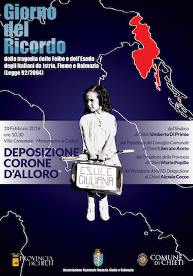 CHIETI – In occasione del Giorno del Ricordo, istituito con Legge 92/2004 per commemorare tutte le vittime delle foibe e dell’esodo degli italiani dell’Istria, Fiume e Dalmazia, l’Amministrazione Comunale partecipa alle celebrazioni istituzionali organizzate su tutta la provincia che si svolgeranno domani, mercoledì 10 febbraio 2016.