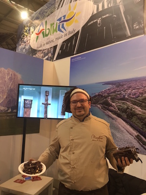 Massimo Di Florio, ingegnere edile di Lama dei Peligni, nel Parco Nazionale della Maiella, ci rivela che da una passione personale è arrivato a creare un’azienda di produzione di tartufi che commercializza in tutto il mondo; Daniele e Fabrizio Longobardi di Alba Adriatica da un anno hanno lanciato il marchio Freezerino, un elegante contenitore termico da tavola per bottiglie di vino e spumanti, con un progetto innovativo e brevetto registrato nel mercato europeo. Altro prodotto interessante, fortemente innovativo, sono i cosmetici a base di latte d’asina di un’azienda agricola di Casalbordino, in cui è impegnata tutta la famiglia, dichiara Patrizia Garofalo, dall’allevamento degli asini alla commercializzazione dei cosmetici; la partecipazione negli anni precedenti all’Artigiano in Fiera ha permesso di aprire l’impresa ai mercati internazionali con spedizioni di prodotti anche in Cina. Dario Longo, giovane chimico siciliano, trapiantato a Lanciano, con la passione per il teatro dei burattini, ha invece aperto un laboratorio artigianale di produzione di burattini, t-shirt e shopper di tessuto ricamato. Ed ancora: è di Isola del Gran Sasso, Eugenio Merlini (v.foto), cioccolatiere e gelataio, con una passione per l’informatica e la grafica pubblicitaria, e che racconta il suo amato Gran Sasso con le proprie produzioni di qualità che valicano i confini regionali; da Penne, infine, Valeria De Melis (v.foto), con una laurea in Scienze del Turismo ora impegnata in studi di Enologia, giovane produttrice di Montepulciano d’Abruzzo e di vino cotto, si fa portavoce del territorio vestino, dal mare al Gran Sasso.