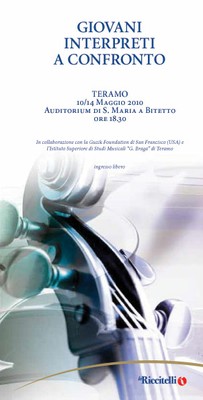 TERAMO – Dal 10 al 14 maggio, alle ore 18, presso l’Auditorium di S. Maria a Bitetto, andrà di scena la Rassegna musicale “Giovani Interpreti a confronto”, organizzata dalla Società della Musica e del Teatro “Primo Riccitelli” in collaborazione con la Guzik Foundation di San Francisco (USA) e l’Istituto Superiore di Studi Musicali “G. Braga” di Teramo.