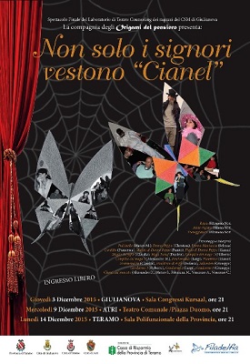GIULIANOVA (TE) – Il teatro come strumento terapeutico e come risorsa per conoscersi, esplorare se stessi e migliorare l’armonia e il rapporto con la propria individualità. É questo l’obiettivo del primo laboratorio di “teatro counseling” curato dalla compagnia teatrale “Gli Origami del Pensiero” con il coinvolgimento dei ragazzi ospiti del Centro Diurno giuliese. Il laboratorio, iniziato ad ottobre, si è concluso con la produzione della della commedia “Non solo i signori vestono Cianel” in scena a Giulianova (giovedì 3 dicembre, Palazzo Kursaal, Lungomare Zara ore 21), Atri (mercoledì 9 dicembre, Teatro Comunale in Piazza Duomo, ore 21) e Teramo (lunedì 14 dicembre, Sala Polifunzionale della Provincia, ore 21). L’ingresso è gratuito.