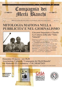 GIULIANOVA – Legalità e lotta alle mafie: Giovanni Impastato e Claudio La Camera ospiti dei Merli Bianchi per la rassegna della Compagnia giuliese sull’“impegno civile e la pratica della memoria attiva”, in programma a marzo nella sala culturale ‘Yuko Nakachi’ di Giulianova, in via Matteotti 115. Domani ,10 marzo, Giovanni Impastato (fratello di Peppino ucciso dalla mafia a Cinisi nel 1978) e Claudio La Camera (regista e responsabile dell’Osservatorio della ‘ndrangheta di Reggio Calabria) terranno una conferenza-dibattito sulla ‘Mitologia mafiosa nella pubblicità e nel giornalismo’. La conferenza si svolgerà a partire dalle 18.30 nella sala ‘Yuko Nakachi’.