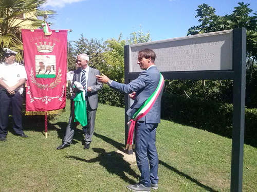 Successivamente si è proceduto, nel poco distante spiazzo erboso su via Piave, intitolato a Giovanni Antonio Campano, allo scoprimento della riproduzione dell’epigrafe quattrocentesca della fondazione della città acquaviviana donata al Comune dal Lions Club Giulianova.