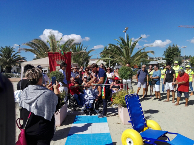 GIULIANOVA – Oggi, lunedì 14 agosto 2017 è stata inaugurata la spiaggia libera a misura di disabile, “Mare per tutti”, posta sul lungomare sud tra le concessioni Lido “Serenella” e “Negril”. Accessibile tramite nuovi stalli sosta riservati ed una passerella di 64 metri con piazzole di manovra, isola di servizio, la spiaggia libera a misura di disabile mette a disposizione dei fruitori un bagno con doccia in una struttura fissa e, grazie alla Eco.Te.Di., una Job, una carrozzina-sedia mare per disabili studiata per raggiungere, tramite ruote, lo specchio acqueo.