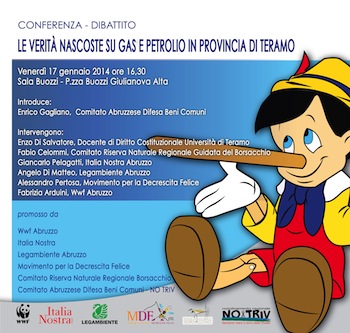 GIULIANOVA (TE) – Venerdì 17 gennaio, alle ore 16.30, presso la Sala Buozzi a Giulianova Alta si terrà la Conferenza – dibattito delle sigle ambientaliste per scoprire dai documenti che saranno esibiti “Tutto ciò che dovreste sapere e che nessuno vi ha mai detto” su gas e petrolio a Teramo . Ad oggi – a meno di un cambio di rotta immediato – il rischio reale è che l’estrazione di gas e petrolio possano diventare a breve parte integrante della vita economica e sociale della provincia di Teramo, dell’intera regione Abruzzo.