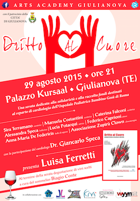 GIULIANOVA (TE) – Finale d’estate all’insegna della solidarietà per l’Associazione Culturale non-profit “ARTS ACADEMY” di Giulianova che, il 29 agosto alle ore 21 nel Palazzo Kursaal di Giulianova, ha organizzato una serata per presentare il libro “Dritto al cuore” che promuove la raccolta di fondi destinati al Progetto “Mettici il Cuore” in favore del reparto di cardiologia dell’Ospedale Pediatrico Bambino Gesù di Roma.