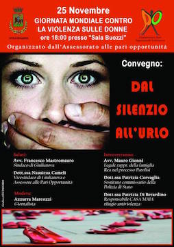 GIULIANOVA (TE) – Il 25 novembre prossimo, in occasione della Giornata Internazionale contro la violenza alle donne, l’Assessorato alle Pari Opportunità ha organizzato in Sala “Buozzi”, a Giulianova,a partire dalle ore 18, il convegno “Dal silenzio all’urlo”.