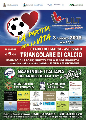 AVEZZANO (AQ) – Un triangolare di calcio per arrivare al traguardo della vita tutti assieme, prima che vi arrivi il nemico tumore. La Lega Italiana per la Lotta contro i Tumori della Provincia di L’Aquila non si stanca di ripetere il suo motto giornaliero alla popolazione: «Prevenire è vivere, anche nei mesi estivi. Il ricavato dei biglietti della partita di calcio del 3 agosto, sarà devoluto interamente per l’acquisto di un ecografo a beneficio dei due laboratori provinciali della Lilt».