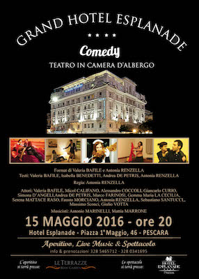 PESCARA – Un caffè con i giornalisti per presentare la pièce teatrale “GRAND HOTEL ESPLANADE COMEDY”. Lunedì 9 maggio alle ore 11.00 nella Sala conferenze dell’Hotel Esplanade (I Piano) in Piazza I Maggio, 46 a Pescara sarà presentato il format di Teatro che si “consuma” in Camera d’Albergo, ideato da Valeria Bafile & Antonia Renzella con la collaborazione alla drammaturgia di Isabella Benedetti e Andrea De Petris e presentato dall’Associazione culturale Acculae.
