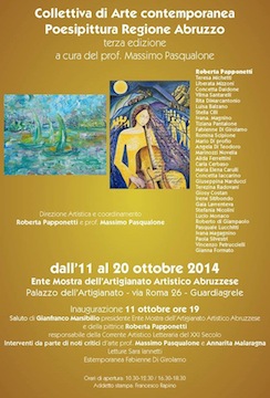 GUARDIAGRELE – Oggi pomeriggio alle ore 19, presso l’istituto Mostra di Guadiagrele, ci sarà l’inaugurazione della “Collettiva di Arte contemporanea Poesipittura Regione Abruzzo”. Si tratta della terza edizione della manifestazione d’arte organizzata dalla responsabile per la regione Abruzzo Roberta Papponetti e curata dai critici d’arte Massimo Pasqualone e Anna Rita Malaragna che interverranno durante la manifestazione artistica ed esporranno l’argomento della Poesipittura in tutti i suoi aspetti. Ci saranno delle letture di Sara Iannetti. La Collettiva durerà fino al 20 ottobre prossimo.