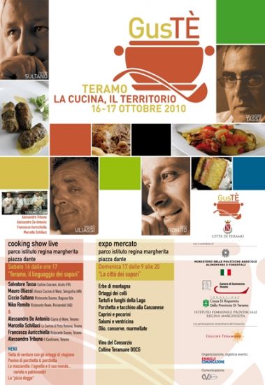 TERAMO – Il 16 e il 17 ottobre si svolgerà a Teramo la kermesse GusTE’Teramo, che avrà per protagonista la straordinaria cucina teramana.La sfida a base di profumi e di sapori vedrà da una parte 4 chef stellati e stellari (Salvatore Tassa, Mauro Uliassi, Ciccio Sultano e Niko Romito, in rigoroso ordine di apparizione), dall’altra 4 grandi cuochi teramani (selezionati partendo dal bel libro “Teramo, il linguaggio dei sapori” firmato dai giornalisti e gastronomi Antonio Paolini e Roberto De Viti). La manifestazione che, si terrà in una tensostruttura allestita nel parco Regina Margherita di piazza Dante, è stata ideata e organizzata dal Comune di Teramo.