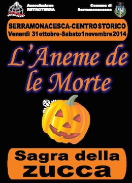SERRAMONACESCA (PE) – Venerdì 31 ottobre e sabato 1 novembre il centro storico di Serramonacesca, paese in provincia di Pescara, si animerà nel tradizionale appuntamento con la Sagra della Zucca. Il titolo della manifestazione, “L’Aneme de le morte” prende spunto dalla tradizione popolare abruzzese ricca di leggende, culti, credenze e racconti inerenti alle festività dell’1 e 2 novembre.