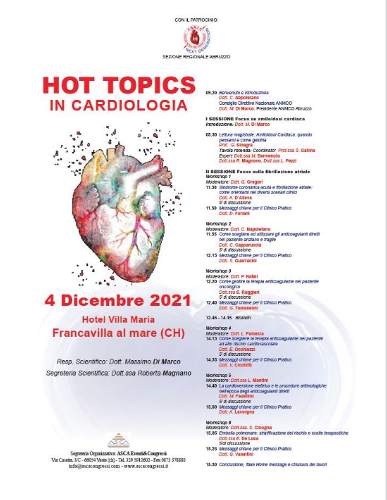 PESCARA – Il 4 dicembre 2021, presso l’Hotel Villa Maria di Francavilla al Mare (Ch), dalle ore 9,00, nella sua cornice prenatalizia, si svolgerà in presenza, il Congresso denominato “Hot Topics in Cardiologia”.