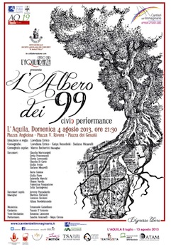 “L’albero dei 99” questo è il titolo del percorso emozionale evocativo individuato e creato appositamente all’interno del centro storico dell’Aquila (a partire da Piazza Angioina, attraverso Via Angioina, Via Antonelli, Piazza Vincenzo Rivera, Via Andrea Bafile, per terminare in Piazza dei Gesuiti) in cui lo spettatore, camminando ed immaginando insieme agli artisti, apre ad una “strada” fatta di ricordi, emozioni, speranze, sentimenti, sensazioni che, mescolandosi, daranno vita ad una nuova realtà condivisa: “cambiare la prospettiva da cui si vedono le cose permette di comprendere che c’è un altro modo di inquadrare fatti e problemi; aiuta a trovare nuove soluzioni, fa intravedere itinerari diversi da percorrere. Insieme…” così dichiara l’ideatrice del progetto Loredana Errico.