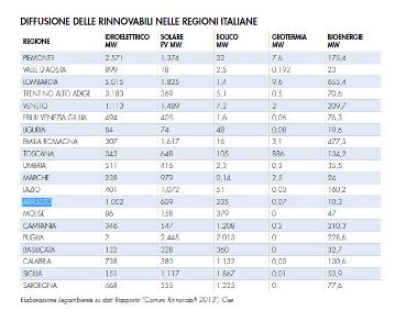 La nostra regione presenta, per l’anno 2012, 1002 MW prodotti da energia idroelettrica, 609 da energia solare, 235 dall’eolico, 0,07 dalla geotermia e 10,3 dalle bioenergie. Un incremento del 35% per quanto riguarda l’energia solare (il dato del rapporto 2012 era 450), e del 60% per quanto riguarda le bioenergie (il dato del rapporto 2012 era 6,4 MW).