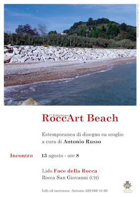 ROCCA SAN GIOVANNI (CH) – Giovedì 13 agosto è in programma la I edizione di RoccArt Beach, estempranea di disegno su scoglio, patrocinata dal Comune di Rocca San Giovanni. L’incontro è previsto alle 8 di mattina di giovedì 13 agosto sotto il ponte di Foce della Rocca. Ad ogni artista verrà fatto estrarre un numero che corrisponderà ad uno degli scogli a diposizione. A fine giornata (ore 19), la giuria che sarà composta dagli stessi artisti partecipanti, voterà l’opera preferita escludendo la propria. Al vincitore sarà assegnata una targhetta messa a disposizione dall’amministrazione comunale di Rocca San Giovanni.