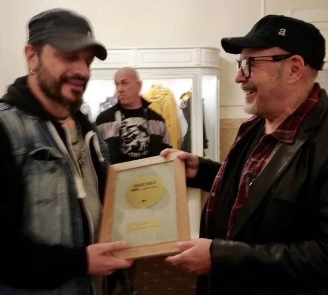 Il singolo dei Kom “Grazie Vasco” è arrivato nelle mani di Vasco Rossi. Una consegna speciale quella che ha visto come protagonista il front man della nota tribute band Mirco Salerni che in un incontro privato ha consegnato personalmente a Vasco la targa ricordo contenente il disco dorato in edizione esclusiva “Grazie Vasco”.