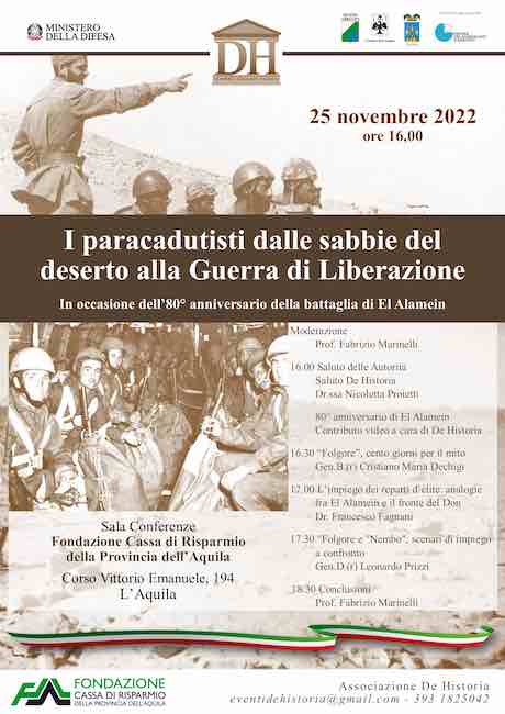 L’80° di El Alamein si innesta infatti sull’80° della Guerra di Liberazione, a cui i paracadutisti della “Nembo” hanno dato un contributo senza pari. Il saluto sarà porto dalla Presidente De Historia, Nicoletta Proietti, e dal Col. Marco Iovinelli, CME Abruzzo e Molise. Circa gli interventi, con Francesco Fagnani, storico e vicepresidente di De Historia, interverranno Cristiano Maria Dechigi, Gen.B.(r), già Vicecomandante Brigata Paracadutisti Folgore e già Capo dell’Ufficio Storico del V Reparto Affari Generali dello Stato Maggiore dell’Esercito, Leonardo Prizzi, paracadutista, Gen.D (r), già Direttore Analisi dei conflitti della Scuola di Guerra e docente di Strategie Globali presso la Scuola di Guerra. Il professor Fabrizio Marinelli, Presidente della Deputazione Abruzzese di Storia Patria, oltre a condurre l’evento, introdurrà spunti di discussione e approfondimento sulla Guerra di Liberazione.