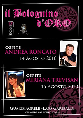 GUARDIAGRELE (CH) – La rassegna canora “Il Bolognino d’oro”, manifestazione ideata e organizzata da Alfredo Scogna, è divenuta ormai un appuntamento stabile e molto atteso nel panorama dell’estate di Guardiagrele.Giunto alla tredicesima edizione “Il Bolognino d’oro” prevede, come già negli ultimi anni, lo svolgimento di due serate, il 14 e il 15 agosto 2010 in Largo Garibaldi a Guardiagrele, in cui si esibiranno circa 40 artisti, cantanti locali e non, di un livello canoro qualitativamente elevato. Come sempre i partecipanti sono stati selezionati ed accuratamente preparati all’interno del laboratorio musicale che il responsabile, il cantautore Alfredo Scogna, organizza per circa 2 mesi prima della manifestazione, creando un clima di coinvolgimento e di socializzazione veramente notevole nei partecipanti.