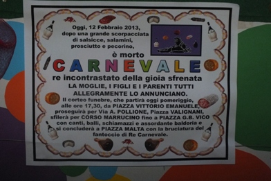 L’evento principale del Carnevale Tradizionale Abruzzese 2013 è stato il corteo caratterizzato da musica, maschere, carri ed in particolare arricchito dal fantoccio di Re Carnevale e dai personaggi della Pantomima. I momenti salienti della rappresentazione: il Processo, la Condanna del Re Carnevale e a conclusione il rituale del rogo del grande Fantoccio. Il falò brucia tutti i mali, purifica , si connota come un rito propiziatorio foriero di buoni auspici che segna la conclusione di un ciclo naturale, l’inverno, e ne inaugura un altro ,la primavera.