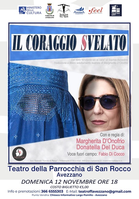 AVEZZANO – Si avvicina alla conclusione “Una scelta difficile”, la rassegna del Teatro OFF all’interno del Teatro della Parrocchia di S. Rocco di Avezzano. Dopo “Zi Fonzo” ed “Effetti Collaterali”, domenica 12 dicembre alle 18 sarà in scena “Il Coraggio (S)velato”. Attraverso la pièce le due attrici e registe Donatella Del Duca e Margherita D’Onofrio daranno voce a una triste realtà che un senso morale e umano devono farci sentire vicina: l’oppressione della donna in alcuni Stati del Medio Oriente e l’uso di pratiche abiette, come la lapidazione.