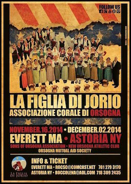 ORSOGNA (CH) – Lo storico Coro folcloristico “La Figlia di Jorio “ di Orsogna è in tour negli Stati Uniti fino al 2 dicembre, per i festeggiamenti delle comunità abruzzesi d’oltre Oceano con l’obiettivo di riscoprire le radici comuni. Domenica il concerto per gli emigranti di Everett, località vicina alla capitale dello stato del Massachusetts. Il Programma di concerti è intenso per il Coro fondato nel 1921 da Attilio Bartoletti, musicista autodidatta, poeta e compositore, servendosi della collaborazione di alcuni giovani che facevano parte della locale Schola Cantorum. “La voce di Orsogna che canta”, dopo Boston raggiungerà New York. Dal 25 novembre il gruppo si sposterà nell’area metropolitana di New York City per il 75° anniversario dell’Orsogna Mutual Aid Society e il 55° anniversario dell’Athletic Club New Orsogna.La professoressa Maria Fosco, orsognese, una delle più attive e conosciute donne di cultura italo-americane ha ricordato: “La grande festa sarà il 30 novembre. Stiamo organizzando le cose perbene. E’ un evento di rilevanza storica,per il 75° anniversario della fondazione, il Congresso degli Stati Uniti ha conferito un riconoscimento speciale all’”Orsogna Mutual Aid Society”. E questo per premiare una iniziativa di grande valore sociale, culturale ed economico. Rileva infatti la professoressa Fosco: “I fondatori erano molto intelligenti. Uomini di forte carattere. Erano contadini e umili lavoratori, ma avevano capito agli inizi del Novecento l’importanza di creare un club per gli immigranti orsognesi”.