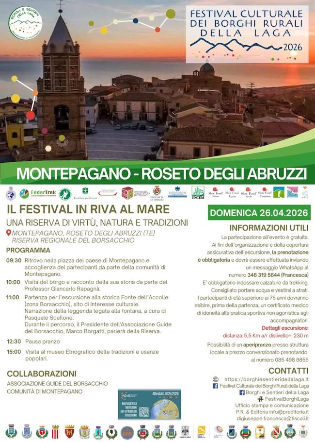 ROSETO DEGLI ABRUZZI – Domenica 26 aprile 2026 Roseto degli Abruzzi ospiterà una giornata dal forte valore simbolico e culturale. Il Festival dei Borghi Rurali della Laga, in collaborazione con l’Associazione Guide del Borsacchio, porta sulla costa adriatica l’evento “Il Festival in riva al mare – Una Riserva di virtù, natura e tradizioni”, un appuntamento che unisce idealmente mare e montagna, territori interni e rivieraschi, in un unico racconto di identità condivisa.