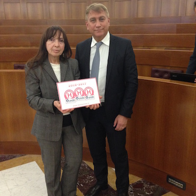La targa è stata consegnata al Dott. Claudio D’Amario, Direttore Generale della ASL di Pescara ed alla Dott.ssa Carmelina Santilli, Responsabile dell’Unità Operativa Semplice Dipartimentale di Ginecologia Sociale della ASL di Pescara e Referente Aziendale Programma Bollini Rosa presso la Sala Polifunzionale della Presidenza del Consiglio di Ministri a Roma.