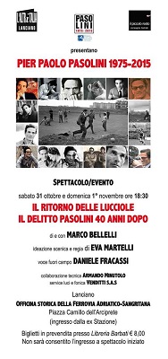 LANCIANO (CH) – In occasione del quarantennale della morte di Pier Paolo Pasolini, avvenuta il 2 novembre 1975, le Associazioni “Il piccolo resto” e “L’Altritalia” intendono rendere omaggio al grande poeta, scrittore, regista ed intellettuale, con lo Spettacolo – evento “Il ritorno delle lucciole: il delitto Pasolini quarant’anni dopo”, inserito nelle commemorazioni ufficiali patrocinate dal Ministero dei Beni delle Attività Culturali e del Turismo.