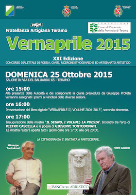 TERAMO – Inaugurata Domenica 25 Ottobre, in occasione della premiazione del concorso Vernaprile 2015, presso la sede della Fratellanza Artigiana di Teramo in via del Baluardo 65, alla presenza del Prof. Giuseppe Profeta, la mostra, che rimarrà aperta per tutto il mese di Novembre (tutti i giorni dalle 17 alle 19:30), presenta opere del Maestro Pietro Cascella (1921-2008), disegni, litografie, piccole sculture, abbinate alle poesie in vernacolo, del Poeta abruzzese Giuseppe Tontodonati (1917-1989), abbinate in una sorta di dialogo artistico che, nel Segno, nei Volumi e nella Poesia ci porta a scoprire il grande amore per la terra d’Abruzzo presente in questi due artisti.