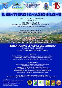 L’AQUILA – Il 30 gennaio prossimo alle ore 10.30, presso la Sala Silone Palazzo dell’Emiciclo a L’Aquila, si terrà la presentazione dell’iniziativa organizzata dal Comune di Pescina, dal Centro Studi Ignazio Silone e dalla Sottosezione del Club Alpino Italiano di Pescina, dal titolo “Il Sentiero Ignazio Silone”.