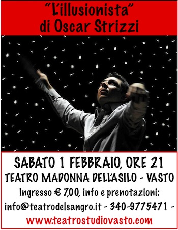 VASTO (CH) – Magia e divertimento di scena sabato 01 febbraio, alle ore 21 presso il Teatro Madonna dell’Asilo a Vasto con lo spettacolo “L’Illusionista” per grandi e bambini. Un magico viaggio ideato ed interpretato dall’abruzzese Oscar Strizzi tra giochi di prestigio e ombre cinesi.