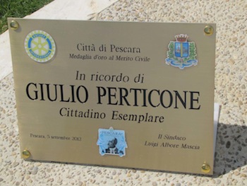 n uomo di grande umanità, e parlo di Giulio Perticone, e approfitto per ringraziare anche gli amici del Rotary Club Pescara della loro presenza, proprio perché Giulio era un Rotaryano doc. Giulio è stato uno dei più grandi sostenitori delle opere che oggi stiamo inaugurando e annunciando, un cittadino ‘interessato’ e innamorato della sua città che per anni aveva chiesto alla precedente amministrazione di modificare quei provvedimenti viari adottati e, dinanzi al muro, mi ha chiesto aiuto e sostegno nella sua battaglia. Io gli ho garantito il mio sostegno e con lui avevo assunto l’impegno di restituire a Porta Nuova la sua viabilità storica, un impegno che purtroppo ha richiesto tempo, e forse il mio più grande rammarico è che oggi Giulio non possa essere qui con noi a celebrare questa giornata che è anche la ‘sua’ giornata, ma sono certo che se anche noi non lo vediamo, in fondo Giulio c’è e lo rivedo negli occhi dei suoi figli, dei suoi familiari e dei suoi amici. E per ricordare Giulio, un cittadino ‘esemplare’, con il Rotary abbiamo voluto installare una targa, ai piedi della fontana e del Monumento, targa dedicata al nostro amico.