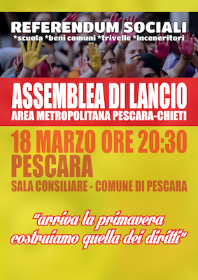 “Ieri sera (venerdì 18 Marzo) in 50, tra studenti, docenti, lavoratori, attivisti e cittadini, si sono riuniti presso la Sala Consiliare del Comune di Pescara per la prima assemblea dei Referendum Sociali.