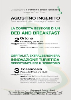 ORTONA (CH) – L’Associazione “Il Cammino di San Tommaso” di Ortona in collaborazione con il Comune di Ortona la DMC “Terre del Sangro Aventino”, Istituzione “Parco dei Priori”, l’Associazione di B&B “Parco Maiella e Costa Trabocchi”promuove e organizza una due giorni con il giornalista e Presidente Nazionale AIGO (Associazione Italiana Gestori Ospitalità e Ricettività Diffusa), Agostino Ingenito, per discutere di slow tourism e ricettività extralberghiera.