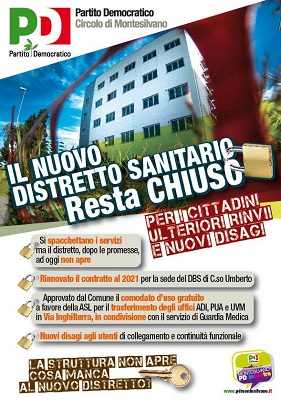 Venerdì 16 ottobre, dalle ore 9:30 il Partito Democratico di Montesilvano organizza, davanti al vecchio Distretto Sanitario di Base di C.so Umberto, una mattinata di sensibilizzazione al tema, per informare utenti e cittadini della gravità di quanto sta accadendo.